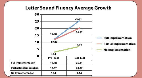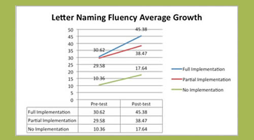While students using the full curriculum of Letters alive made the greatest gains, even those exposed to only a partial implementation showed greater improvement than students in classrooms with no implementation. The two measures taken were the AIMSweb® Benchmark Assessments for Letter Naming Fluency and Letter Sound Fluency. For both measures, the full implementation classroom showed on average more than twice as much improvement as the control classroom.