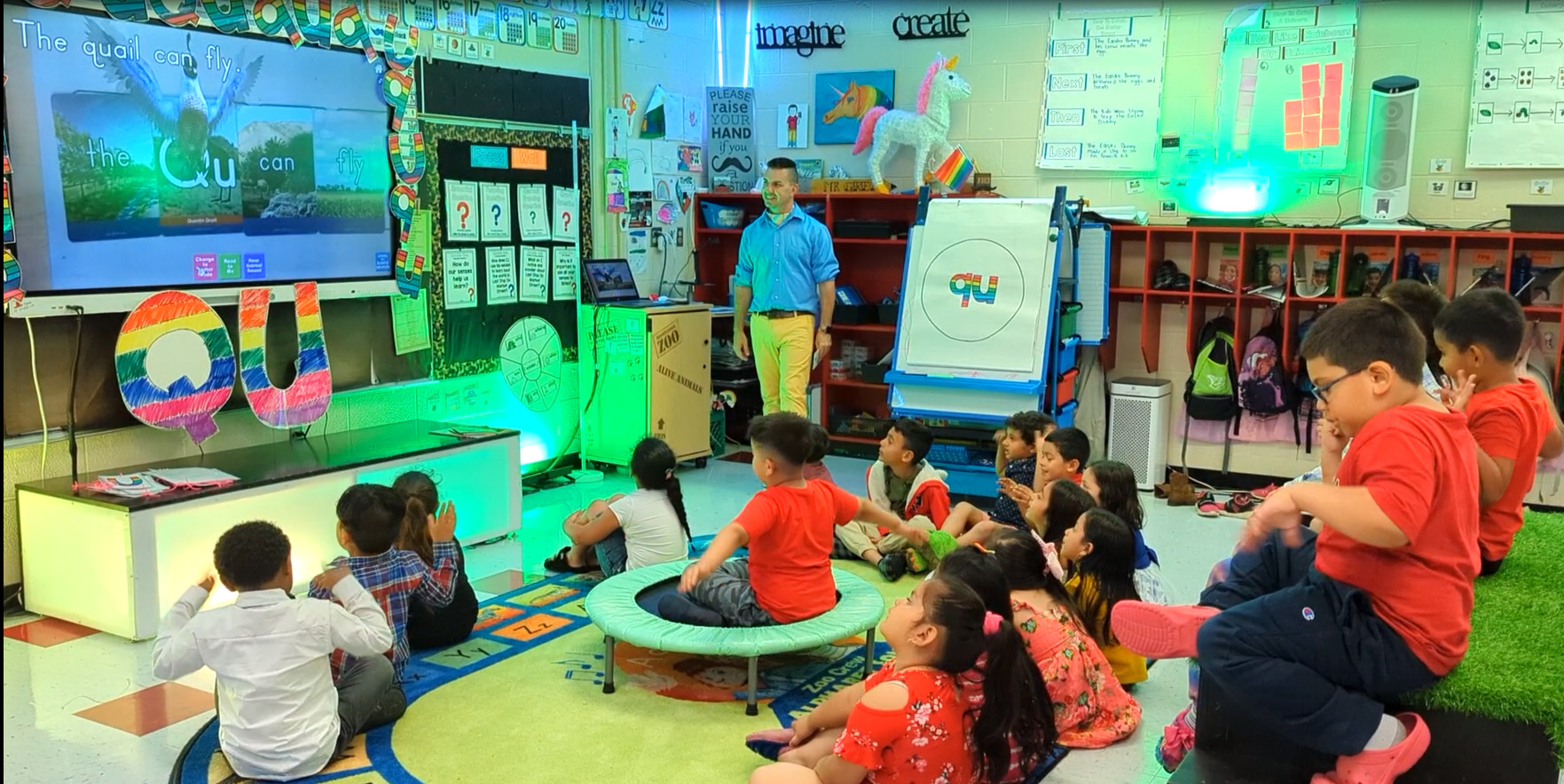 To mix it up, rearrange the seating in a new pattern. Turn your rows into a circle. Put your desks or tables into clusters. If you’re teaching a specific letter or number that day (like the letter “C” or the number “3”), perhaps arrange the tables or desks in that shape. You might consider moving the seats against the wall and sit on the floor for part of the day. (You would be surprised how much my freshmen loved sitting on the floor for lessons.) While visiting Mr. Greg’s classroom, I noticed that his kindergarteners had areas with some sitting on a Rugs alive classroom rug on the floor, some sitting on a raised platform, and one with a special seat atop a mini-trampoline in the middle of the rug. The kids can sit wherever they like, though he does rotate the high-demand areas (like the platform, stage, and mini-trampoline) daily to give everyone a turn. By giving seating options outside the traditional desk or chair, Mr. Greg keeps things fresh and novel.